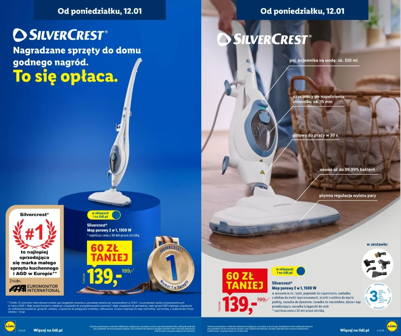 Promocje w Lidlu często mają ograniczoną liczbę sztuk, a małe AGD potrafi znikać bardzo szybko, zwłaszcza gdy cena jest wyraźnie niższa od rynkowej. W tym przypadku start zapowiedziano na 12 stycznia, więc wiele osób może pojawić się w sklepie od rana, żeby zwiększyć szansę na zakup. Jeśli ktoś planował wymianę starego sprzętu lub szukał sposobu na sprzątanie bez chemii, oferta za 139 zł może być jedną z ciekawszych okazji w styczniu. Szczególnie skorzystają osoby, które mają w domu płytki, panele lub inne twarde podłogi i chcą je szybko odświeżać. Dodatkowe końcówki sprawiają, że urządzenie nie musi być „tylko do podłogi”, co zwiększa sens zakupu.